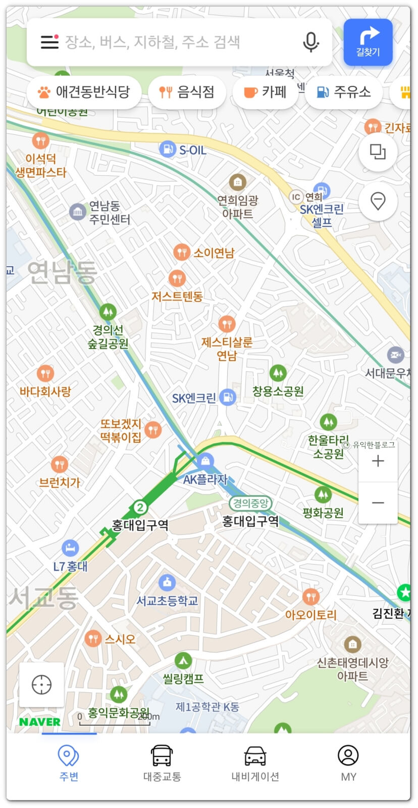 먼저 네이버 지도 앱을 열어줍니다. 만약 설치가 되어있지 않다면, 구글 플레이스토어나 아이폰 앱스토어에서 ‘네이버 지도’ 검색 후 설치해주시면 됩니다.