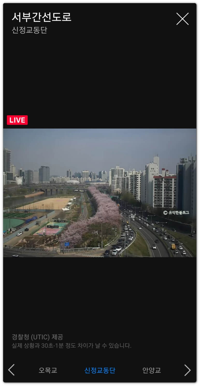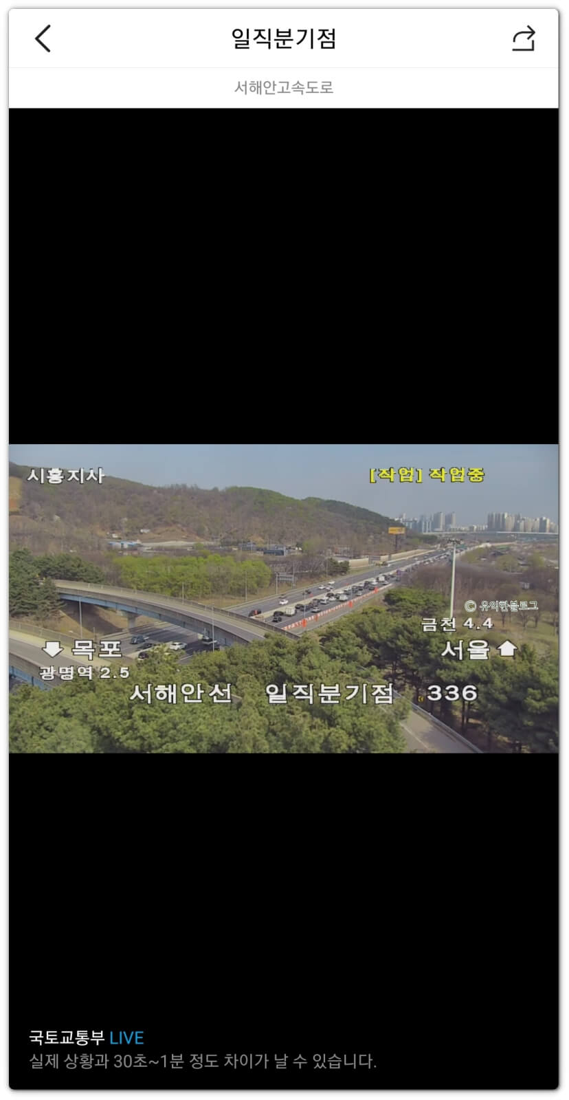 CCTV 화면을 열어본 모습입니다. 참고로 네이버 지도나 카카오맵에서 확인할 수 있는 씨씨티비 화면은 국토교통부에서 제공되며, 실제 상황과는 30초~1분 정도 차이가 날 수 있다고 해요.