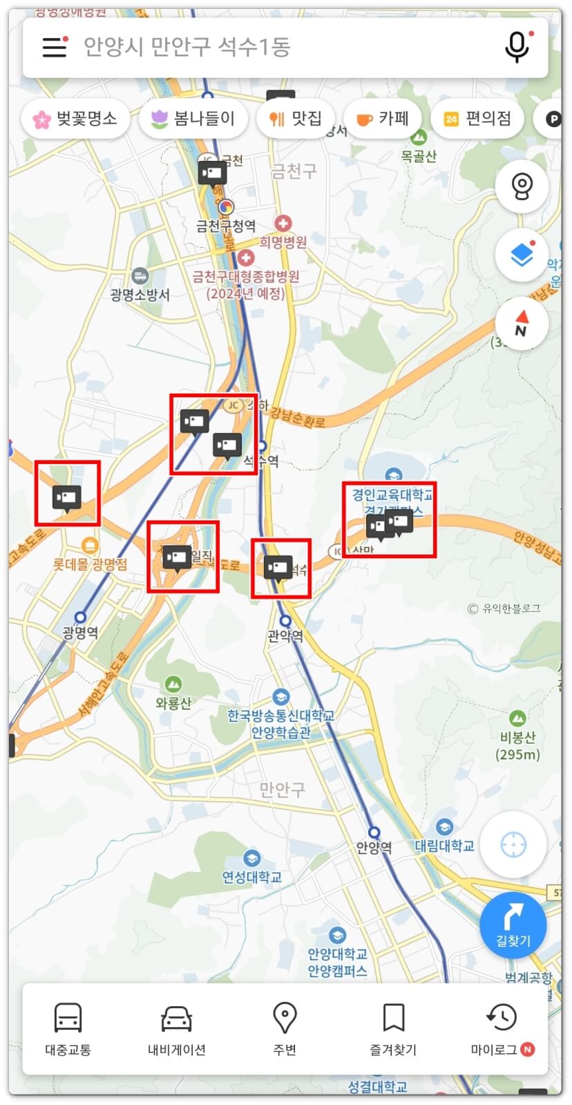 그리고 다시 지도로 돌아오면 아래와 같이 카메라 모양이 지도에 표시되는 것을 볼 수 있습니다. 마찬가지로 카메라 아이콘을 터치하면 실시간 교통정보 cctv를 확인하실 수 있어요.