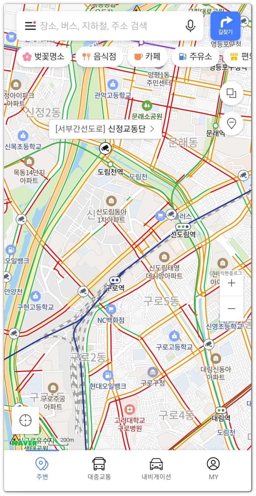 빨간색으로 표시되면 정체, 주황색으로 표시되면 서행, 초록색으로 표시되면 원활하다는 뜻입니다. 물론 실제 상황과 약간 차이가 나는 경우가 있긴 하지만 적절히 참고하시면 큰 도움이 될 듯 해요.