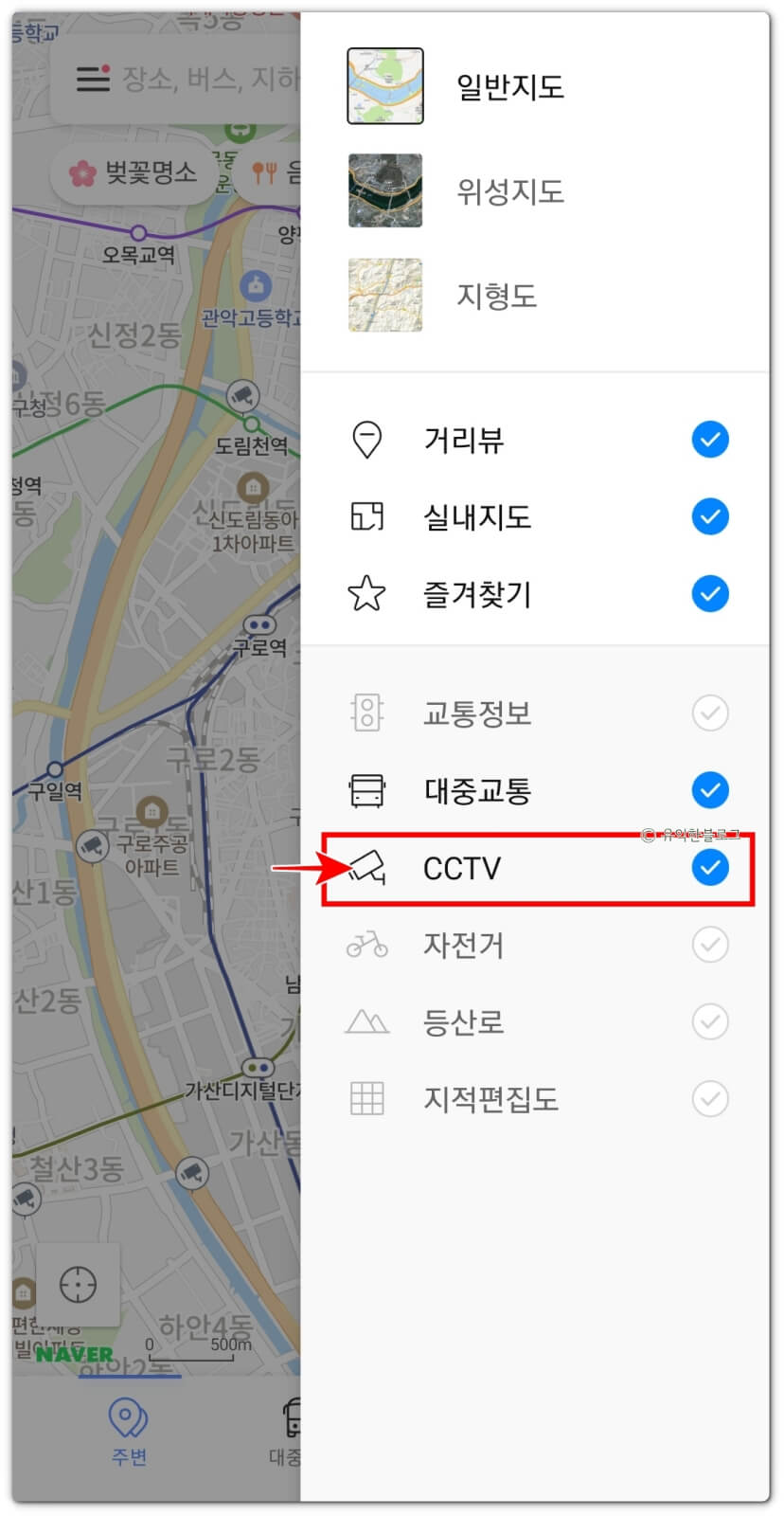 그러면 아래와 같이 지도에 표시할 여러가지 옵션들을 선택할 수 있는 창이 뜨는데요, 여기서 ‘CCTV’라고 되어있는 항목을 체크해줍니다.