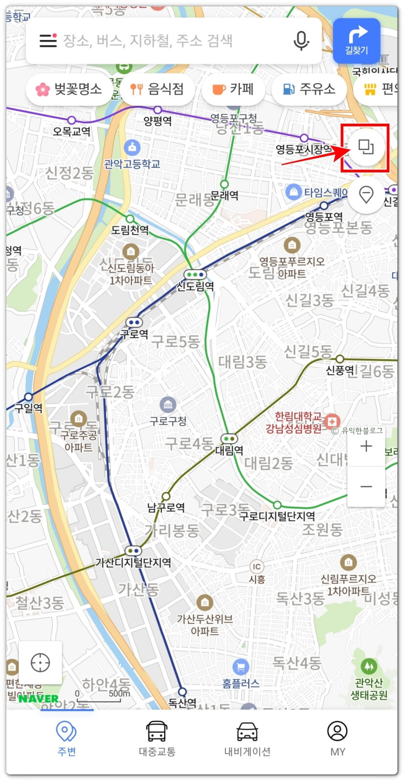그리고 지도 오른편에 있는 네모 모양 아이콘을 터치해주세요.