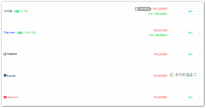 다소 아쉬운 점도 있긴 하지만, 조건만 잘 맞춰 예약한다면 꽤 괜찮은 혜택이 될 수도 있을 듯 합니다. 특히 호텔 예약의 경우 ‘시크릿몰’에 있는 호텔이라면 꽤나 저렴하게 예약이 가능할 듯 하더라고요.