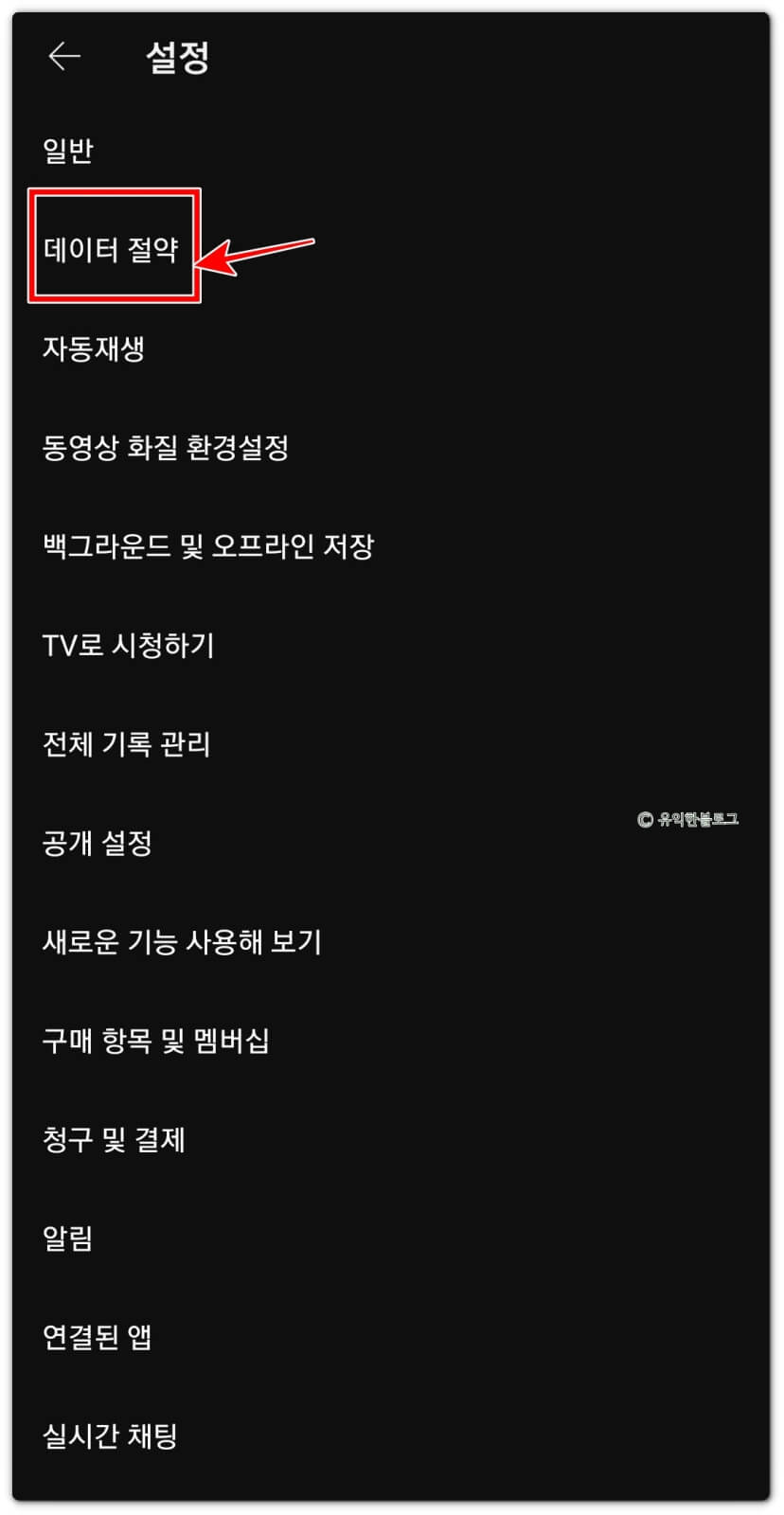 여러가지 설정 메뉴들 중 먼저 ‘데이터 절약’ 항목을 터치합니다.