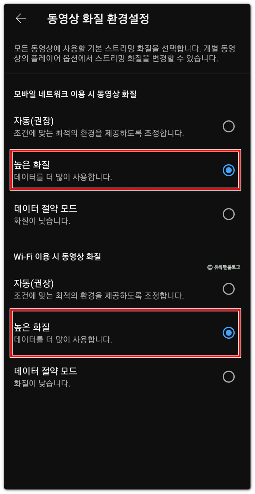 만약 데이터 무제한이 아니라서 데이터를 조금 아껴야 한다, 하시는 분들은 모바일 네트워크 이용시에는 ‘자동’ 또는 ‘데이터 절약 모드’를 선택하고, Wi-Fi 이용시에만 ‘높은 화질’ 로 설정하시면 될 것 같습니다.