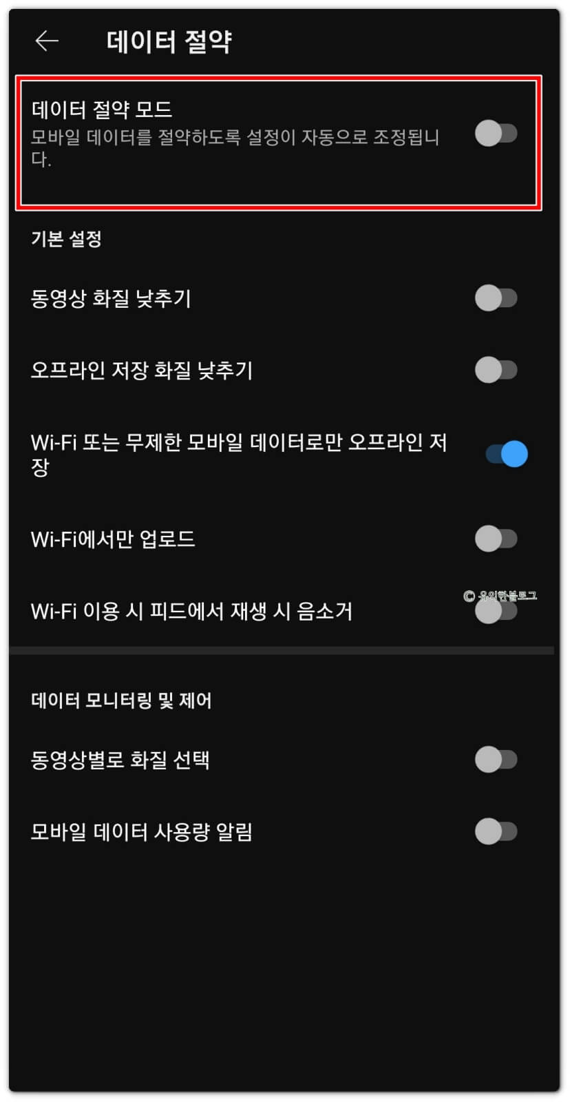 여기서 ‘데이터 절약 모드’를 꺼 줍니다. 또는 ‘동영상 화질 낮추기’만 꺼짐으로 바꿔주셔도 돼요.