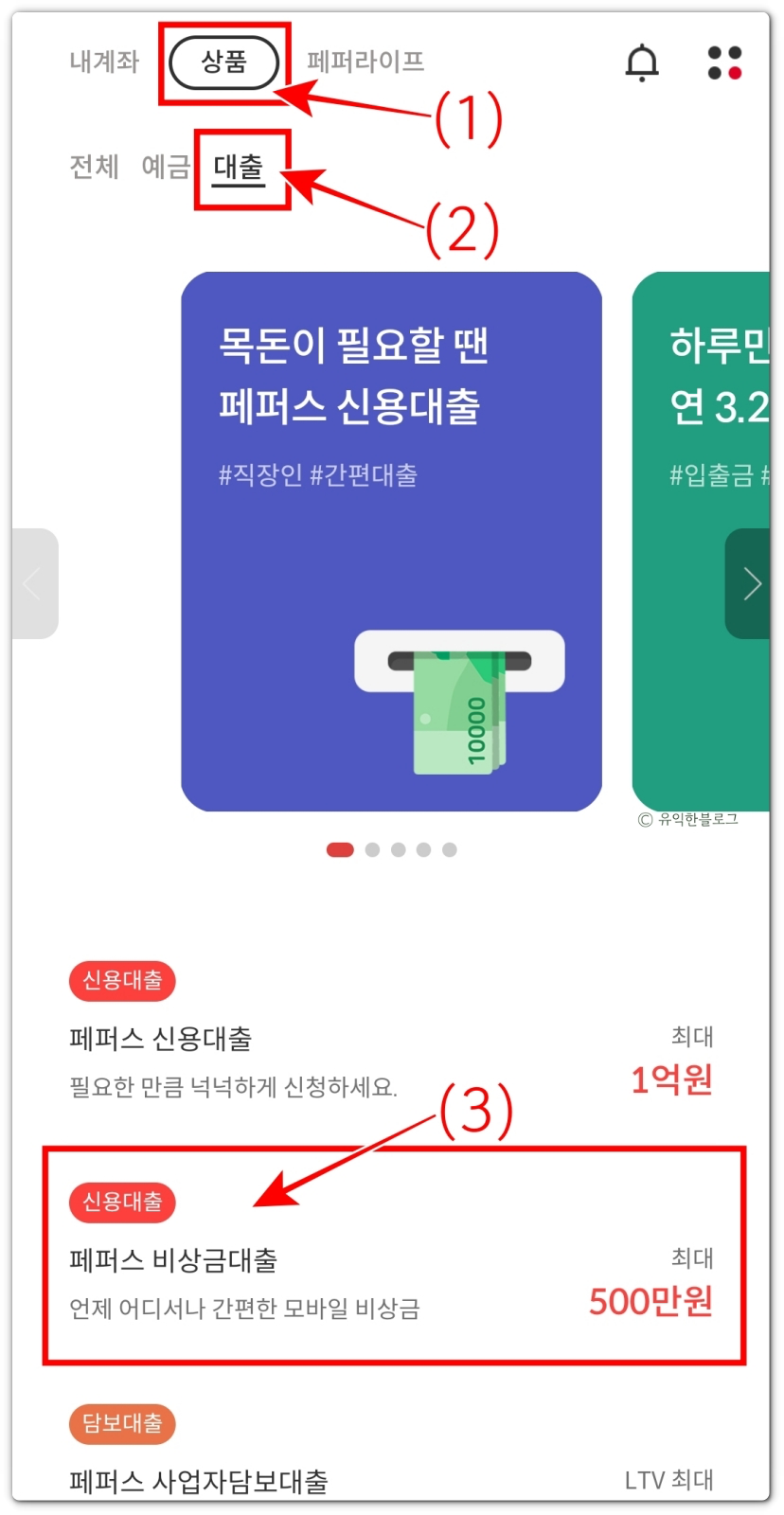 디지털페퍼 앱 실행 후 로그인을 한 다음, 상단의 '상품' 을 선택하고, 그 아래에 있는 '대출' 탭을 선택합니다. 그러면 아래에 대출 상품들이 쭉 뜨게 되는데요, 여기서 '페퍼스 비상금대출' 메뉴를 터치해줍니다.