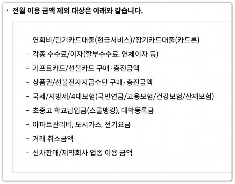 해당 카드의 경우 실적에서 제외되는 대상은 아래와 같다고 해요. 기프트카드, 상품권, 각종 세금, 아파트관리비 전부 제외됩니다.