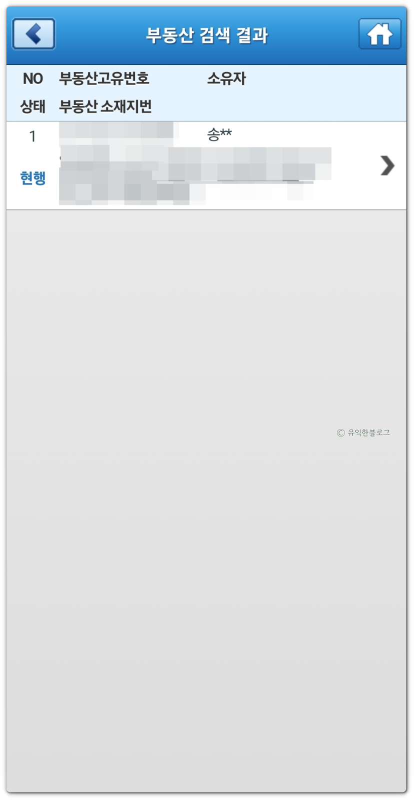 그럼 아래와 같이 소유자의 이름이 표시됩니다. 이름 전체가 뜨진 않고 성까지만 뜨는 것을 볼 수 있어요. 내가 조회할 부동산이 맞다면 한번 더 터치해줍니다.
