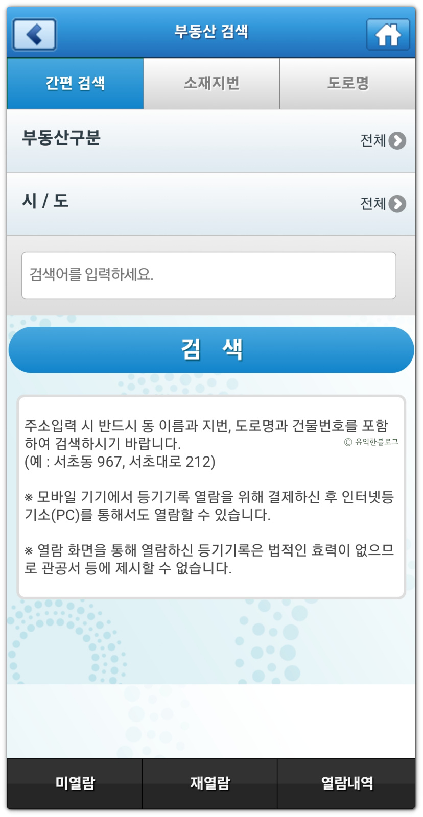 로그인 후 메인 화면에 있는 '부동산 등기열람' 메뉴를 선택합니다. 그럼 아래와 같이 부동산 검색 화면이 뜹니다.