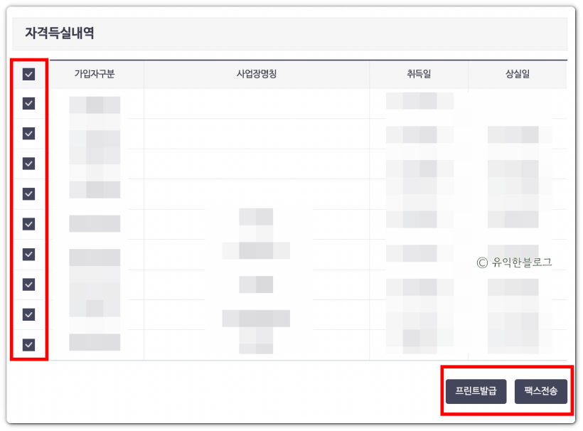 아래에 있는 ‘프린트발급’ 버튼을 눌러 직접 출력해도 되고, 팩스로 전송해야 하는 경우라면 ‘팩스전송’ 버튼을 눌러 바로 팩스로 보낼 수도 있습니다.