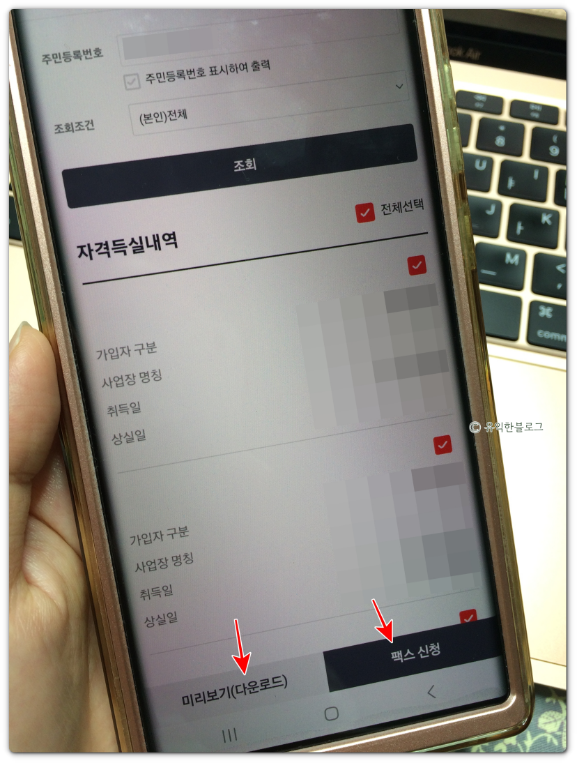 PC버전과 마찬가지로 본인의 자격득실내역이 뜨는 것을 확인할 수 있으며, 전체선택해 발급받거나 원하는 이력만 체크해 발급받을 수 있어요.