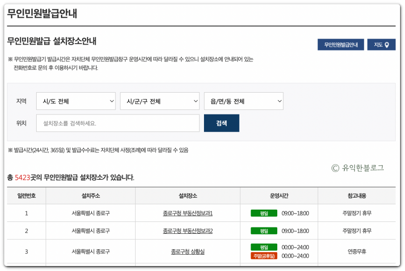 내가 있는 곳 근처 어디에 무인민원발급기가 있는지 모르겠다면 정부 24사 사이트의 무인민원발급 안내를 참조하면 됩니다.