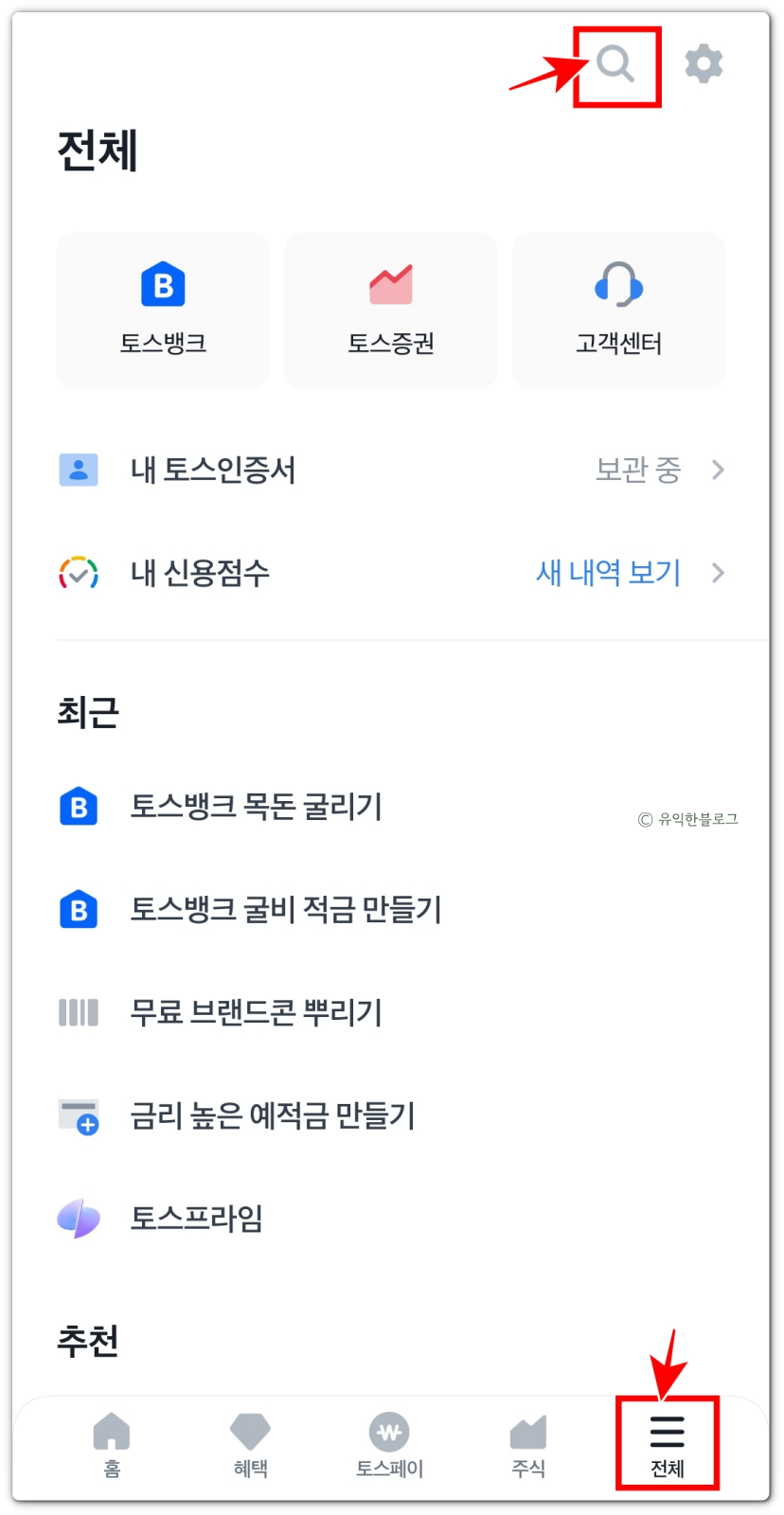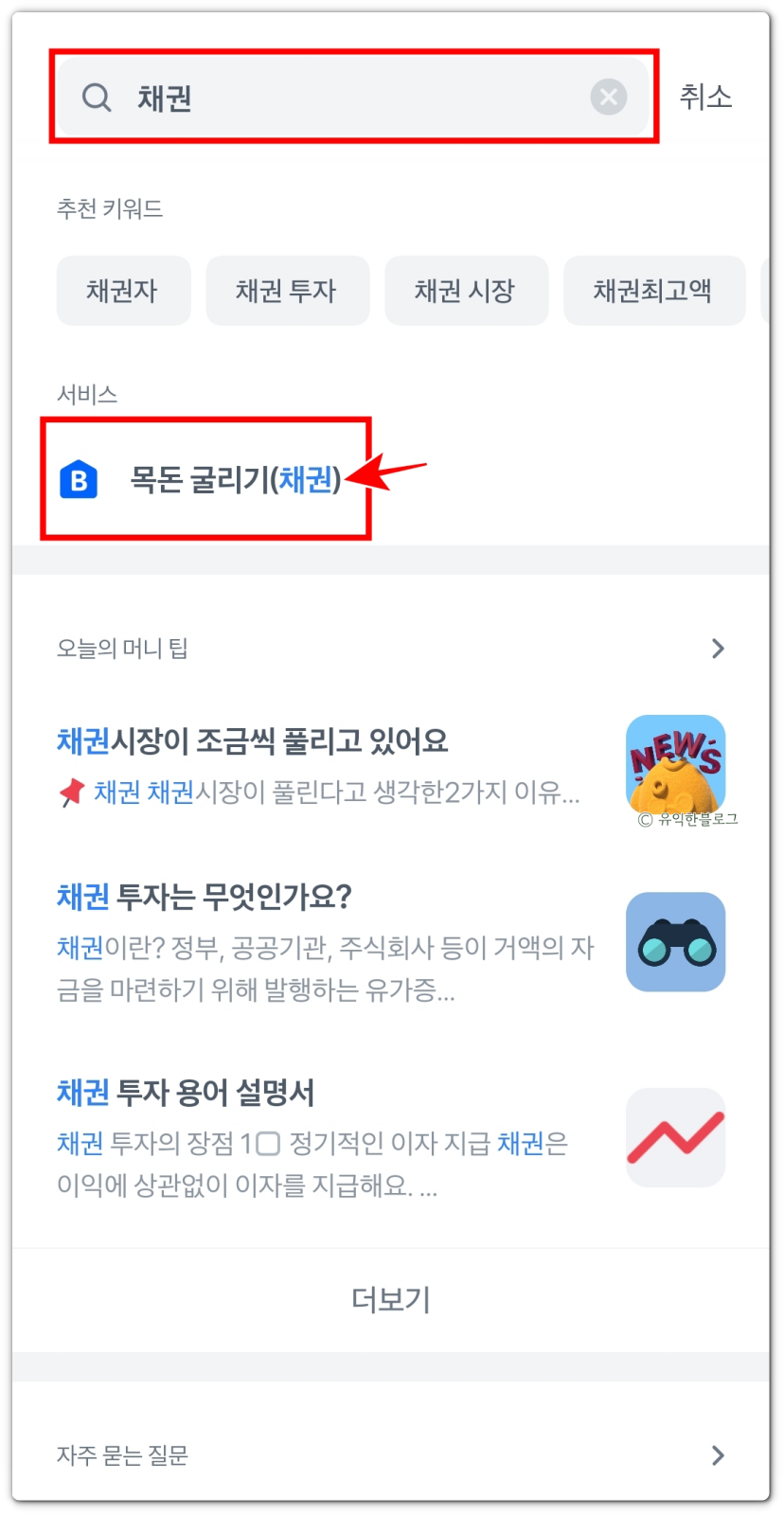 토스 앱 > 오른쪽 하단 [전체]를 누른 뒤, 돋보기를 눌러 검색창을 켭니다. 그리고 ‘채권’이라고 검색하면, [목돈 굴리기(채권)]이라는 메뉴를 찾아보실 수 있어요.