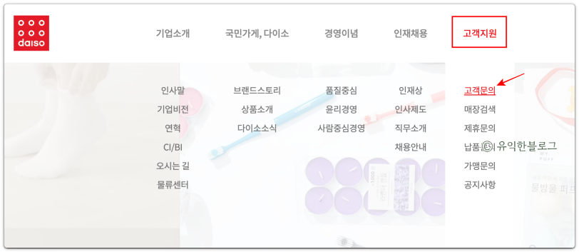 다이소 사이트 접속 후 [고객지원] - [고객문의] 메뉴를 선택합니다.