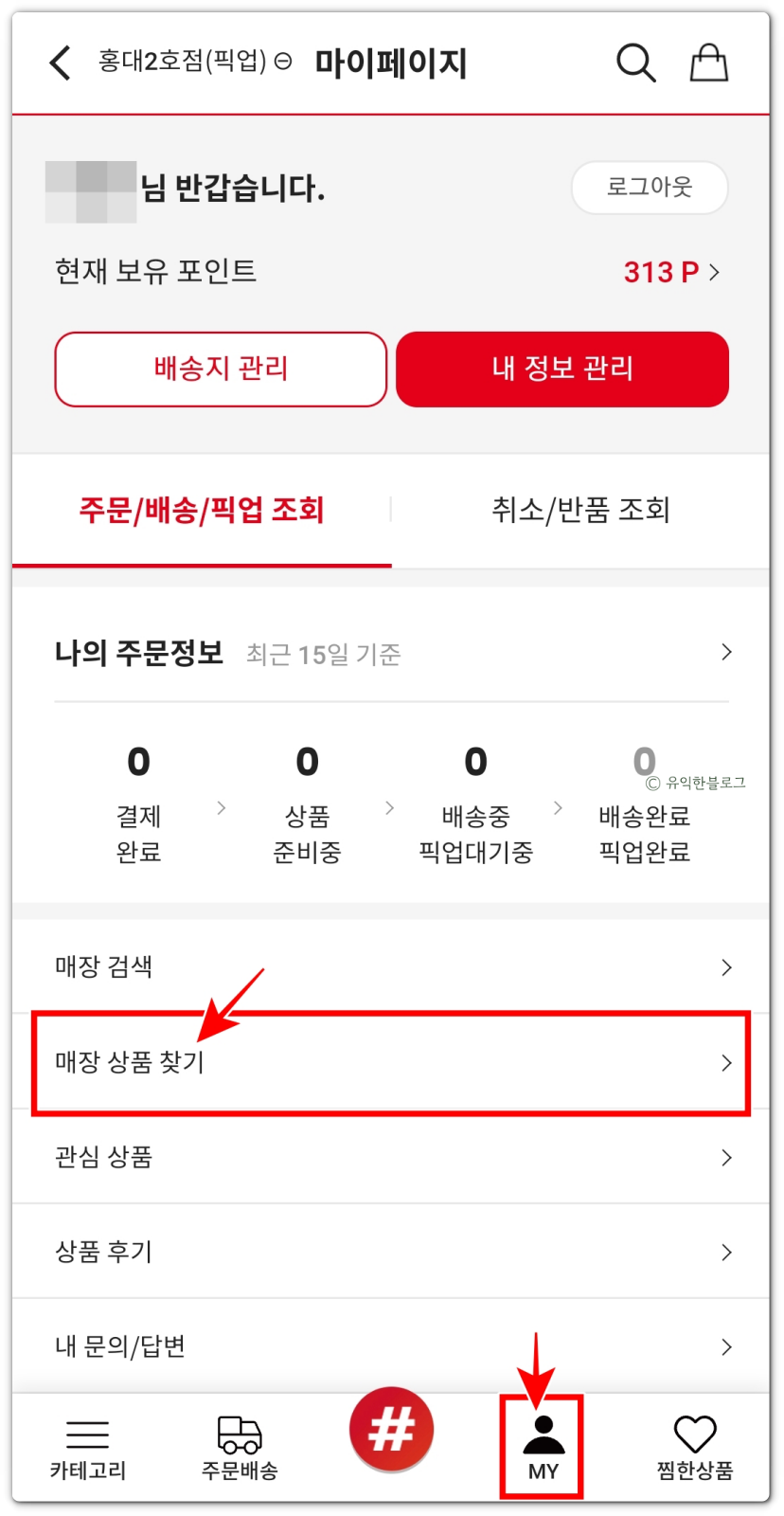 상세한 재고를 확인하기 위해서는 하단 [MY]를 눌러 [마이페이지]로 들어간 다음, [매장 상품 찾기] 메뉴로 들어가면 됩니다.