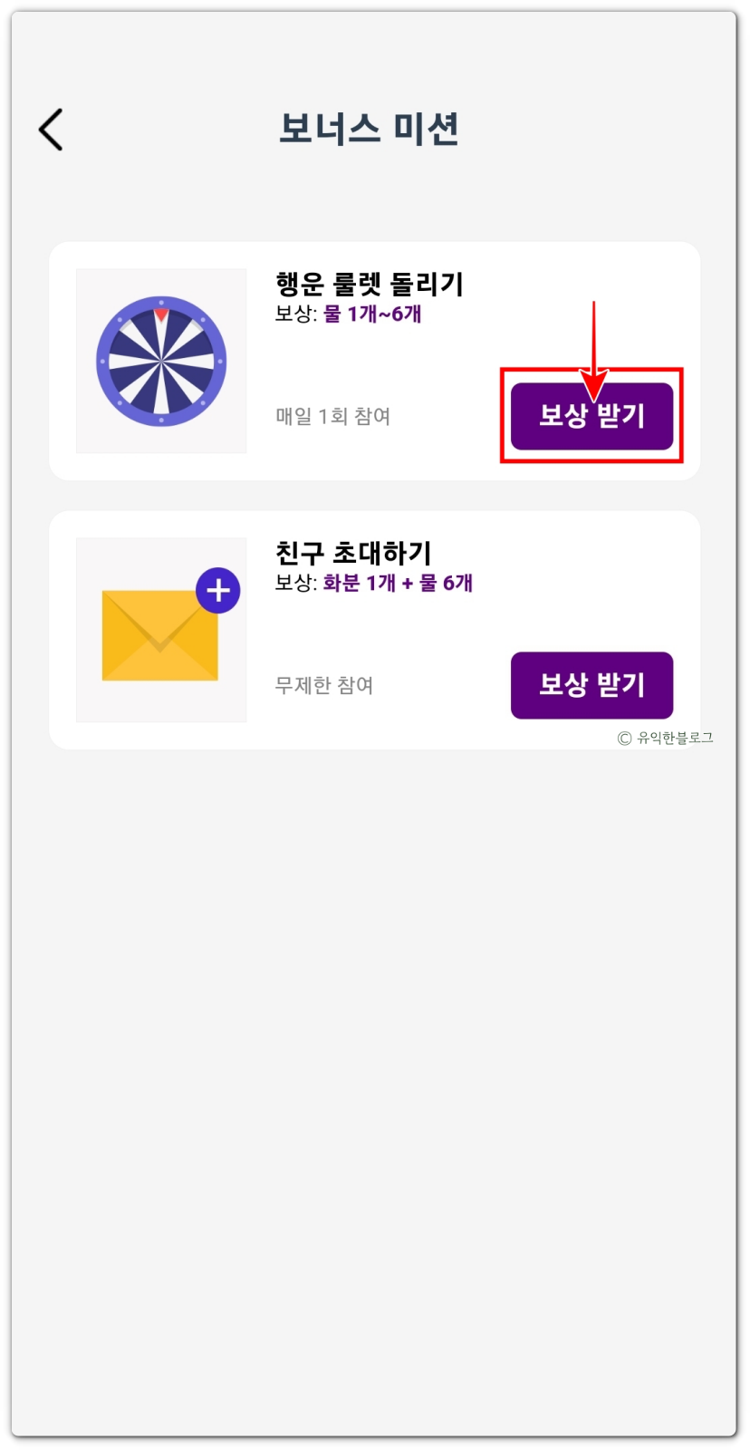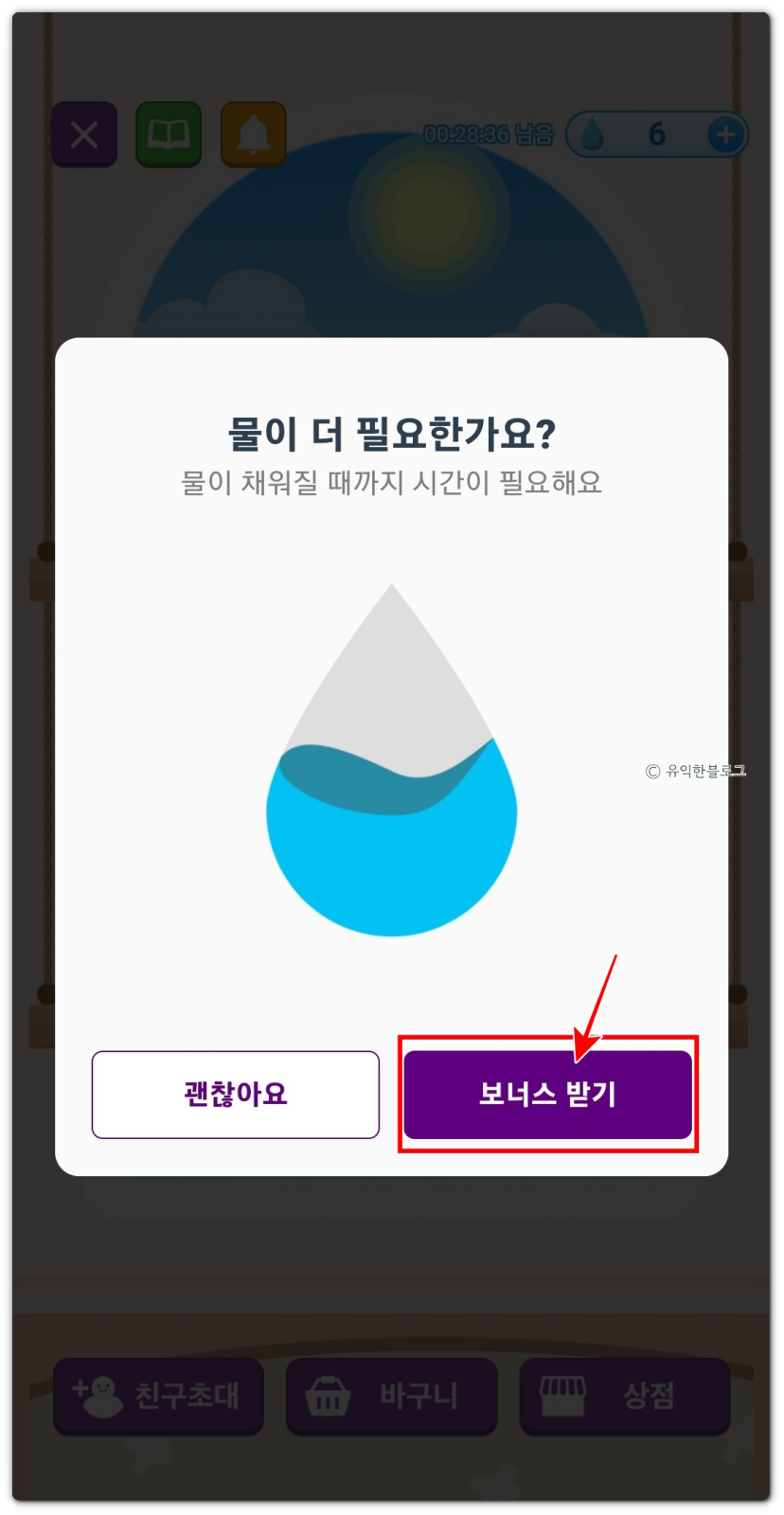 룰렛을 돌리거나 친구 초대를 통해서 물을 추가로 받을 수 있는데요, 물 갯수가 표시된 곳 옆의 ‘+’ 버튼을 누른 다음 [보너스 받기]를 누르면 행운 룰렛을 하루 한 번 돌릴 수 있답니다.
