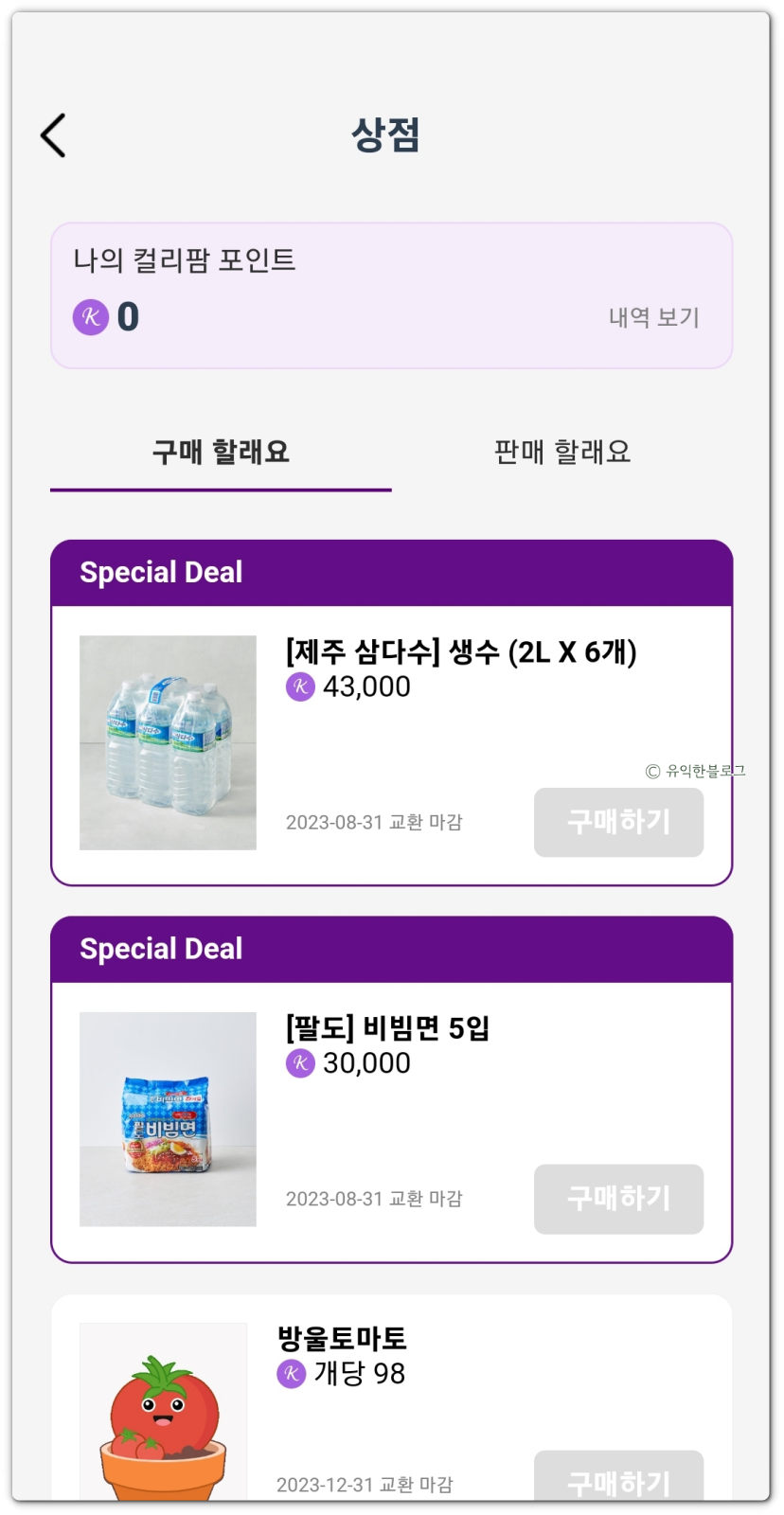 상점에서는 컬리팜 포인트를 이용해 구매를 하거나, 내가 가진 작물을 팔아서 포인트를 얻을 수도 있는 듯 합니다.
