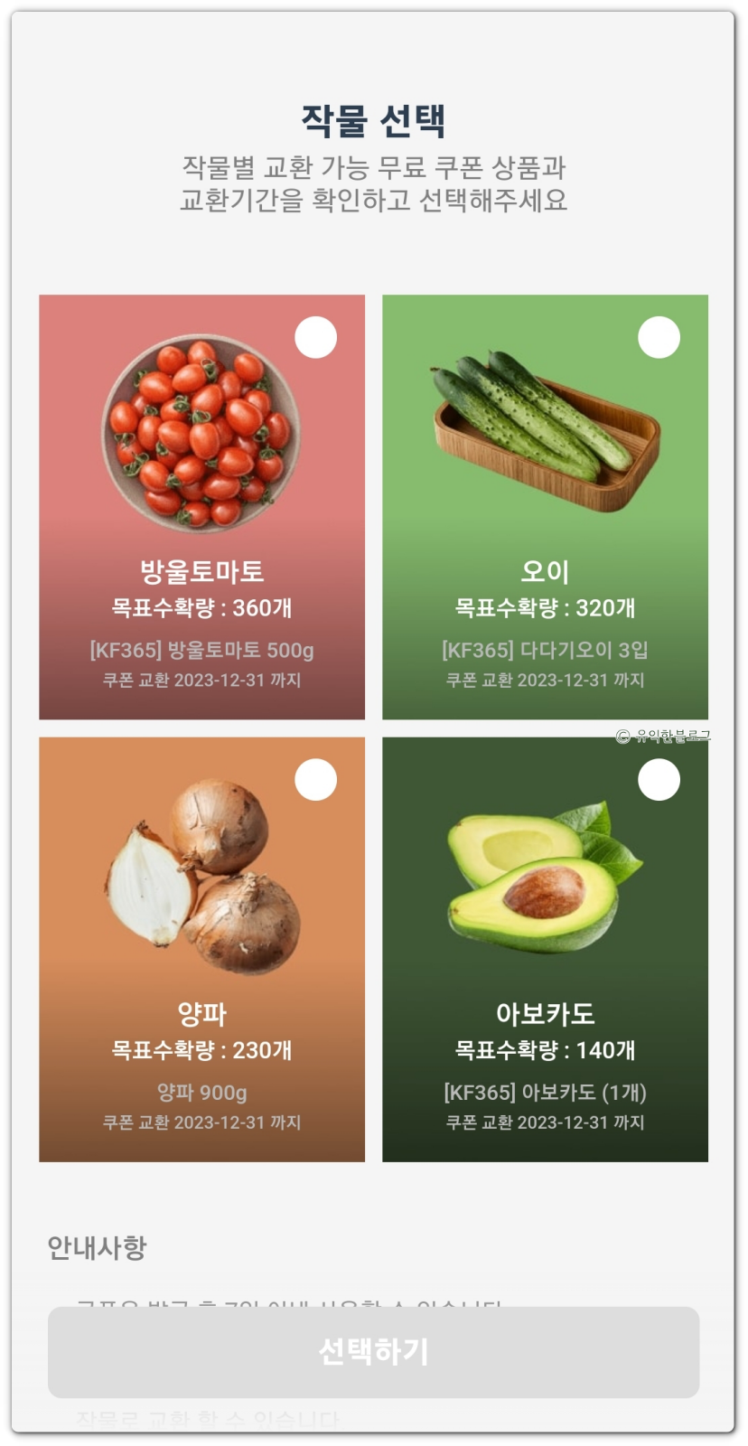 수확한 작물 갯수가 일정 개수에 도달하면 해당 작물을 무료로 받을 수 있는 쿠폰을 받을 수 있습니다.