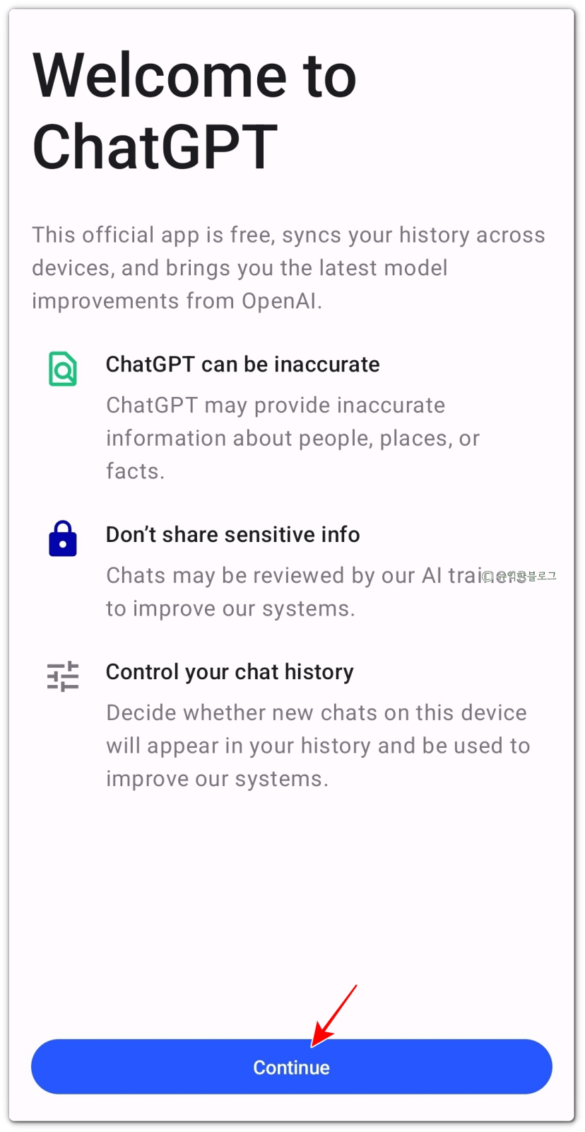 챗GPT는 정확하지 않은 정보를 제공할 수도 있으며, 민감한 정보는 공유하지 말라는 이야기도 보이네요. [Continue] 버튼을 눌러줍니다.