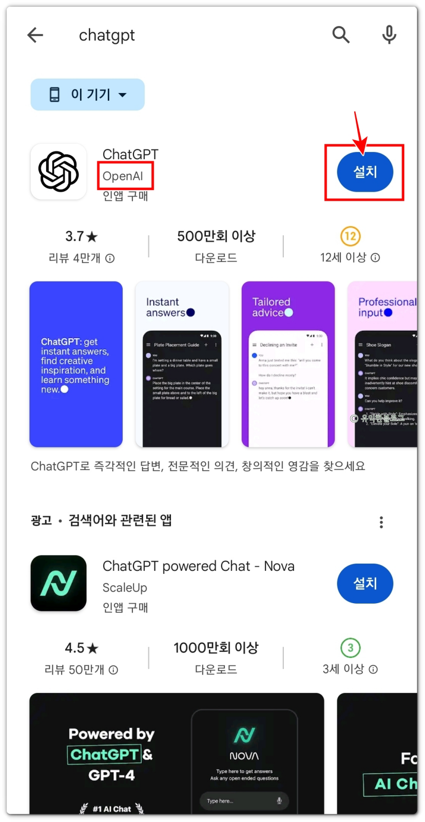 플레이스토어에서 검색창에 ‘chatgpt’라고 검색하면 됩니다. 그럼 아래와 같은 앱이 뜨게 되는데, 이걸 설치해주면 됩니다.