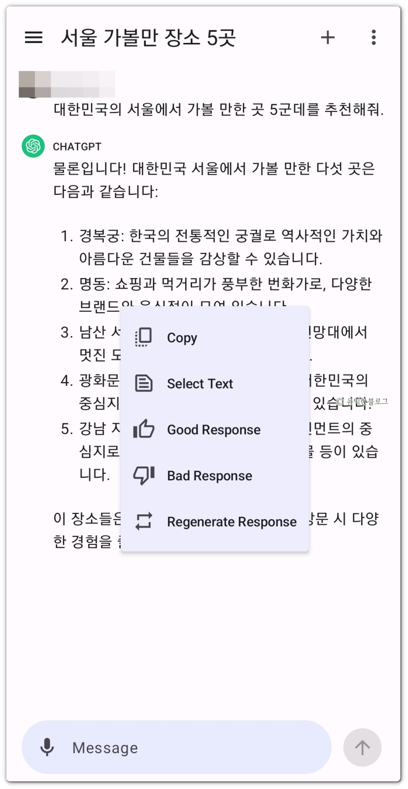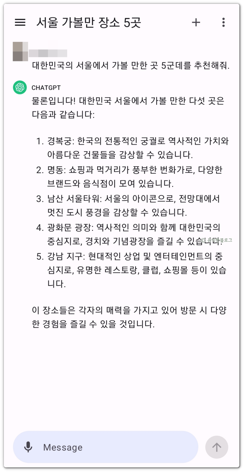 서울에서 가볼 만한 곳 5군데를 추천해달라고 했더니 경복궁, 명동, 남산 서울타워, 광화문 광장, 강남 지구를 추천해 주었네요.