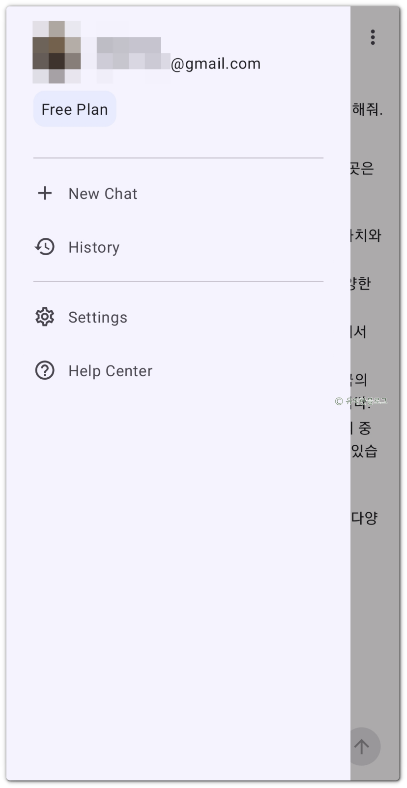 왼쪽 위에 있는 줄 3개 아이콘을 누르면 아래와 같은 메뉴가 뜨는데요, [New Chat]을 눌러 새로운 대화를 시작하거나, [History]를 눌러 과거 대화 내역을 살펴볼 수 있어요.
