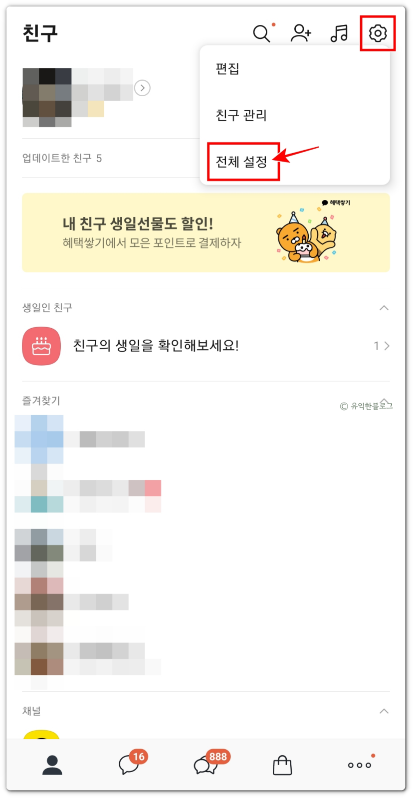 카톡 키워드 알림 설정 방법은 크게 어렵지 않아요. 일단 카카오톡 앱을 켠 뒤, 화면 오른쪽 상단에 있는 톱니바퀴 아이콘을 터치합니다.