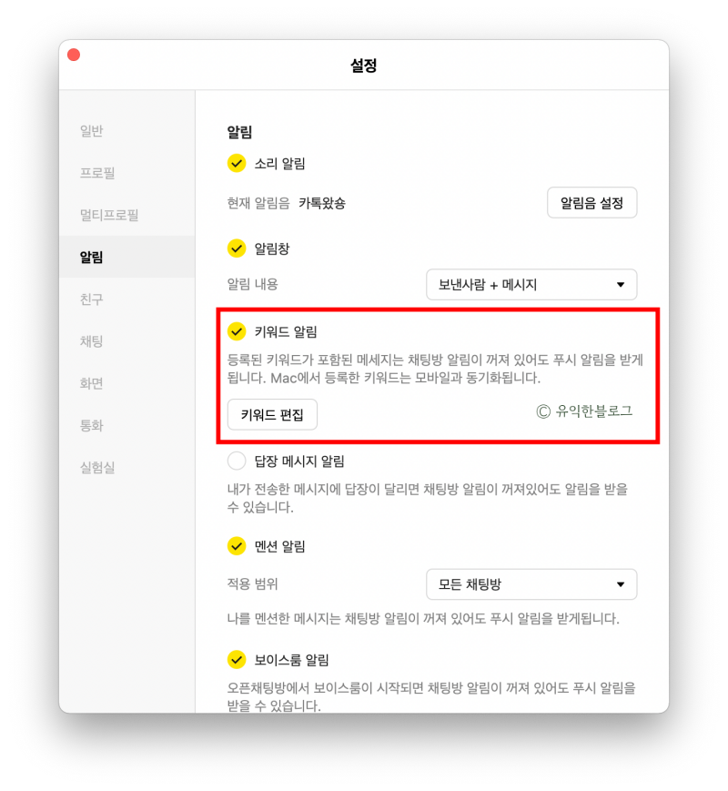키워드의 경우 모바일 카카오톡에서 설정해둔 것이 있으면 그대로 연동이 됩니다. PC버전에서도 [키워드 편집]을 눌러 키워드를 추가할 수 있고, PC에서 추가한 키워드 역시 연동이 되므로 참고하시길 바래요.