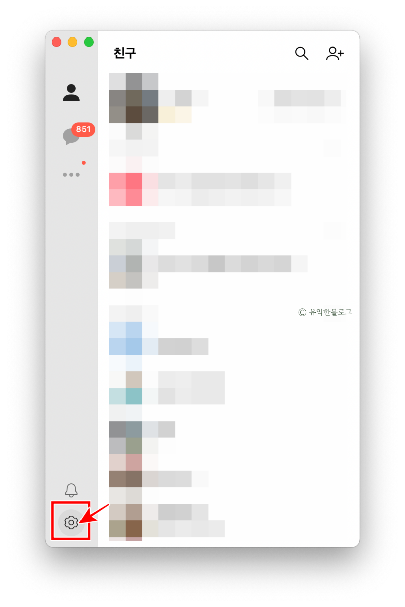 PC 카카오톡 화면 왼편에 보면 톱니바퀴가 보이는데요, 이걸 누른 뒤 [설정] 메뉴를 클릭합니다.