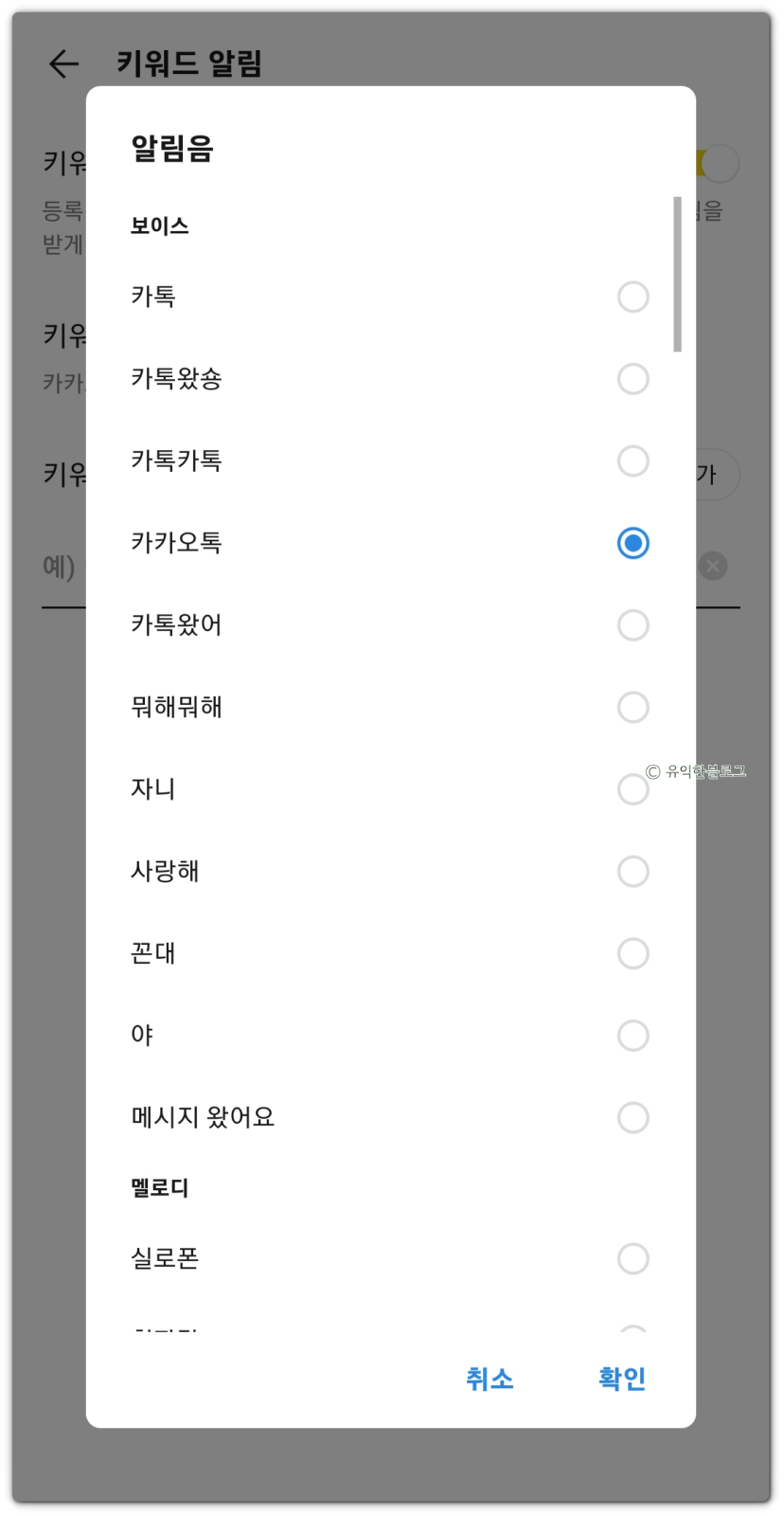 [키워드 전용 알림음] 메뉴를 누르면 별도의 알림음을 선택하는 것도 가능해요. 설정해두면 알림 소리만 듣고도 해당 키워드가 포함된 내용이 대화방에 올라왔는지 여부를 알 수 있게 됩니다.