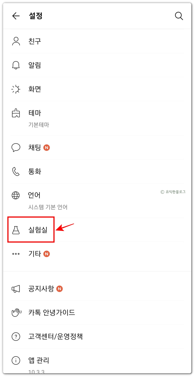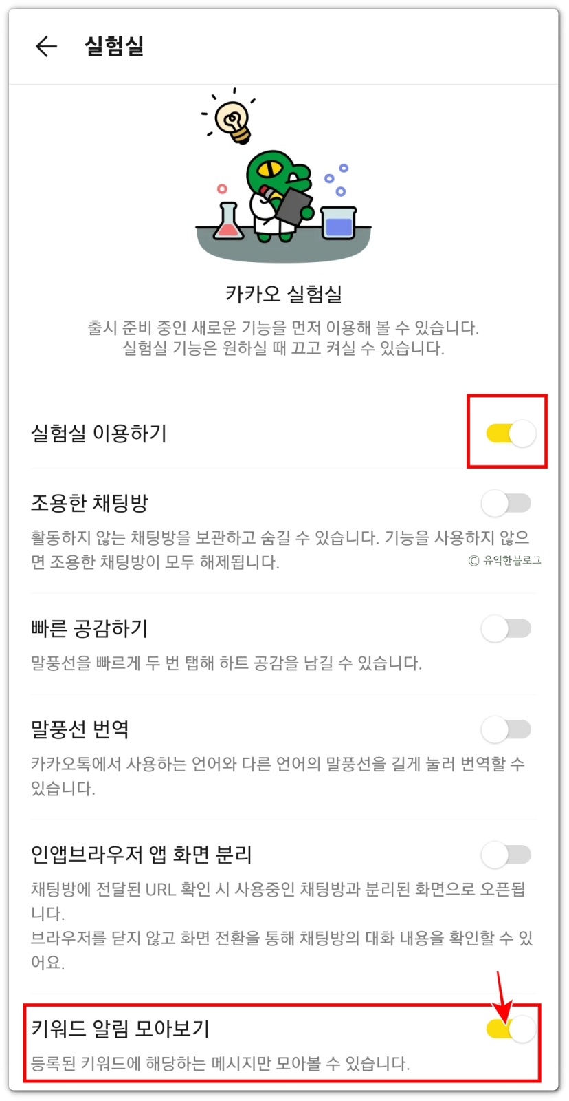 내가 설정한 키워드가 포함된 메시지만 따로 모아서 볼 수도 있습니다. 카카오톡의 ‘실험실’ 기능을 이용하는 것인데요.