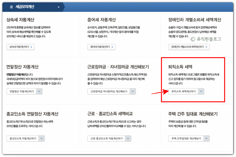 국세청에서 제공하는 퇴직금 세금 계산기를 활용하면 간단하게 계산할 수 있습니다. 아래 링크를 통해 국세청 세금 모의계산 페이지로 이동한 뒤, [퇴직소득 세액]을 선택하시면 됩니다.