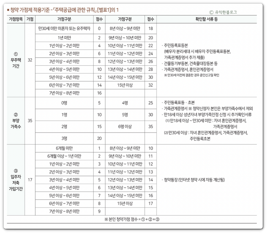 무주택기간, 부양가족, 입주자저축 가입기간 등에 따라 가점이 계산되는데요, 기준과 계산 방법은 아래 내용을 참고하시면 됩니다.