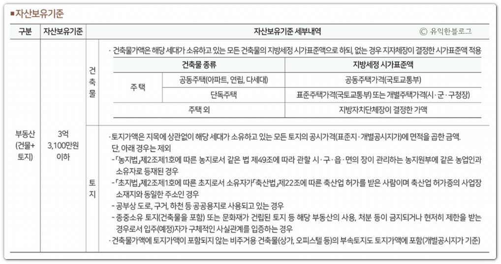 소득기준과 자산보유 기준은 아래 표를 참조하시면 됩니다.