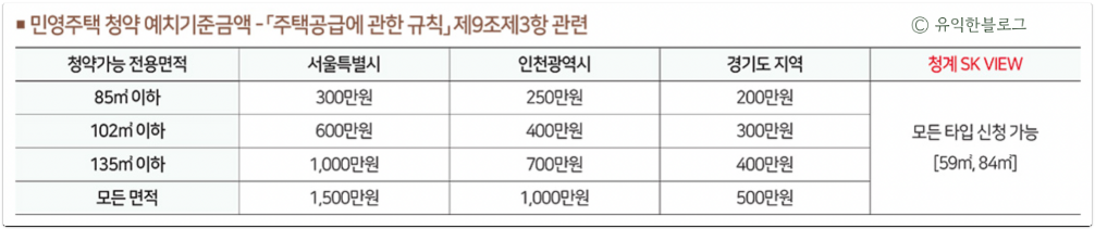 또한 청약통장(+예금/부금/저축) 가입 12개월 경과되어야 하며, 예치금액의 경우 아래 기준을 충족하면 59타입, 84타입 모두 신청이 가능합니다.