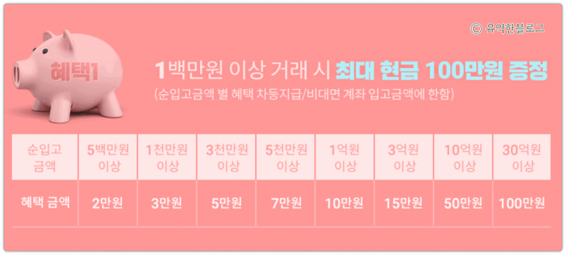 순입고 금액에 따라 차등으로 혜택이 지급되는데요. 500만 원 이상일 경우 2만 원, 1천만 원 이상일 경우 3만원, 30억 원 이상일 경우 최대 100만 원까지 지급됩니다.