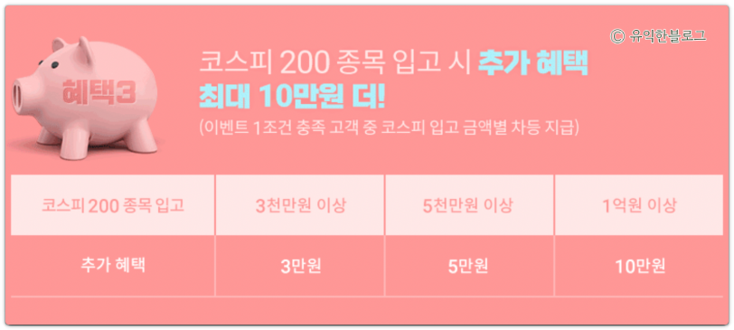 대체입고한 국내주식이 KOSPI(코스피) 200에 포함되는 종목이라면 해당 종목의 입고 금액에 따라 3만 원, 5만 원, 10만 원의 추가 현금 혜택도 제공됩니다.