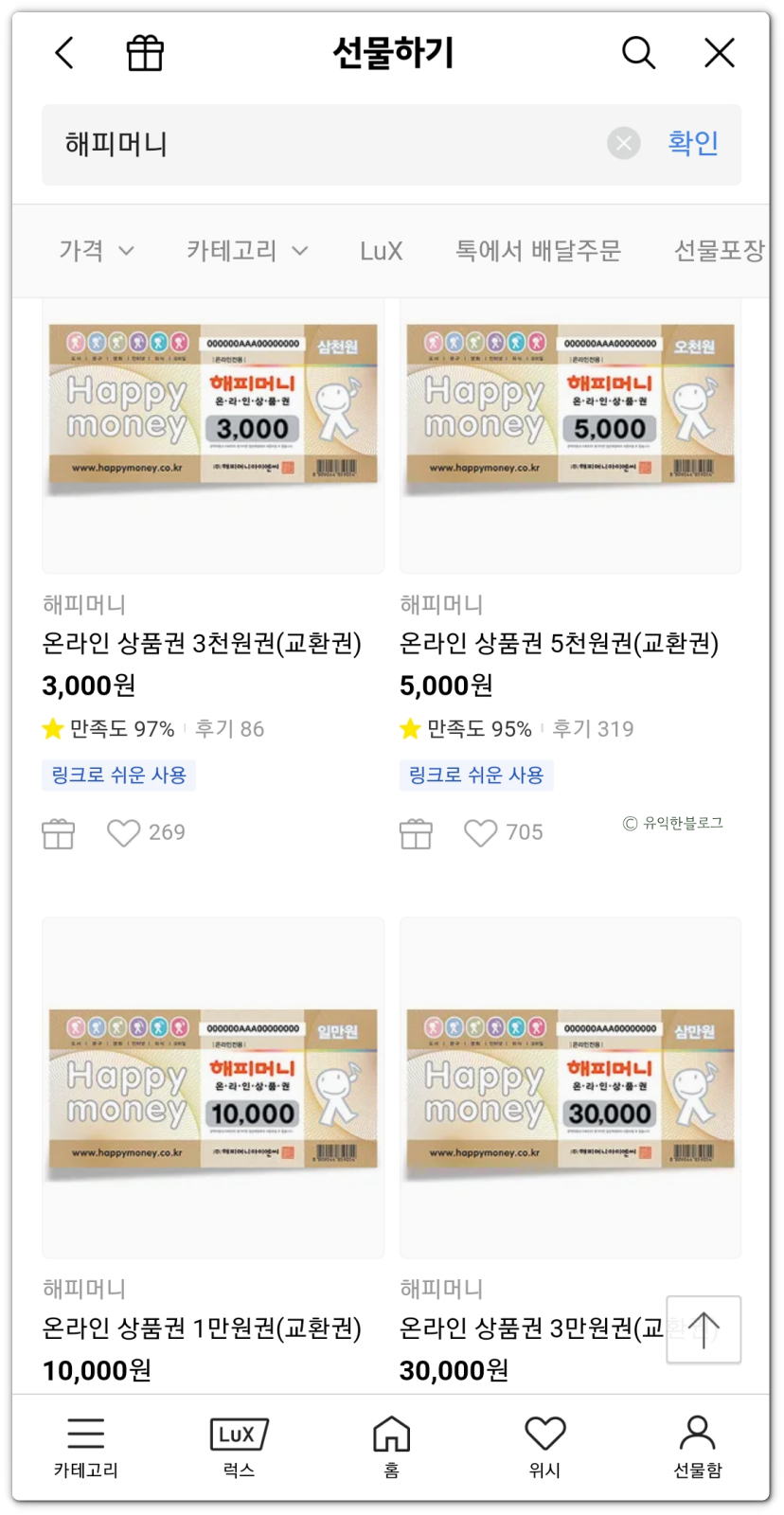 - [카카오 선물하기]에서 먼저 해피머니 상품권을 카카오페이 포인트를 이용해 구입합니다.