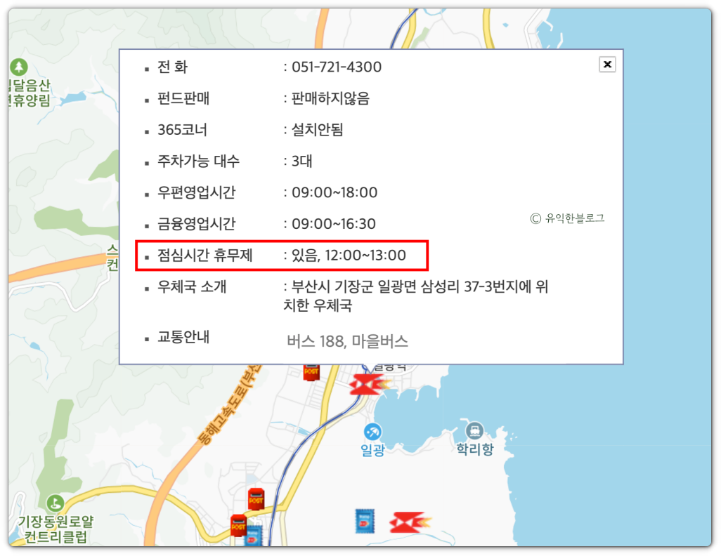점심시간 휴무제를 적용하는 우체국의 경우 아래와 같이 따로 표시가 되어 있습니다.