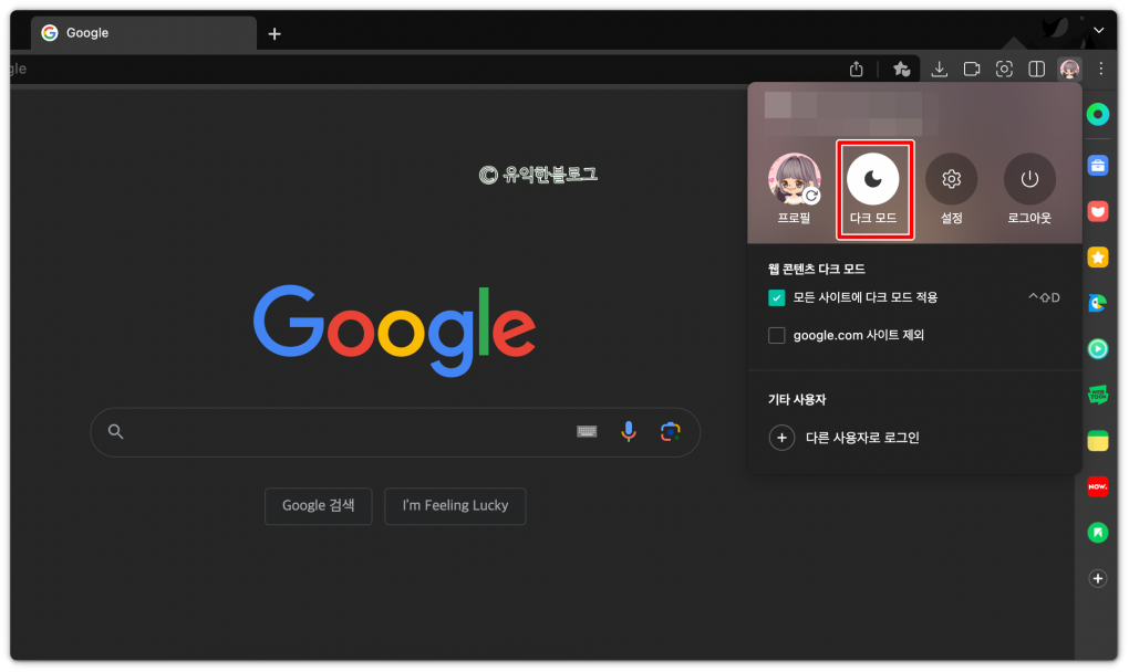 웨일 다크모드를 해제하기 위해서는 [다크 모드] 아이콘을 다시 눌러 꺼 주시면 됩니다.