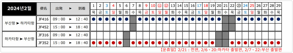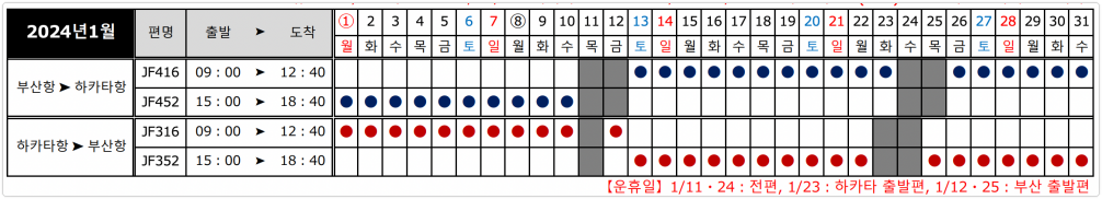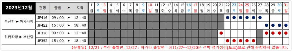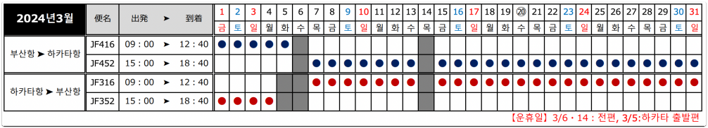 2023년 12월~2024년 3월까지의 스케줄 및 시간을 보면 아래와 같습니다. 표에서 동그라미 표시가 있으면 해당 시간에 운행을 한다는 뜻이에요.