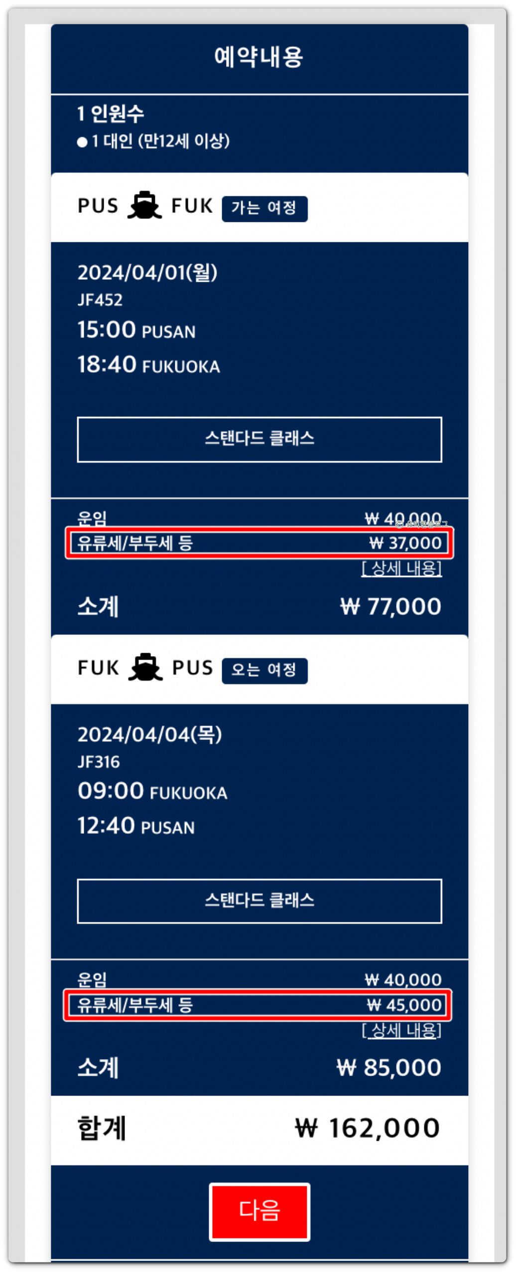 - 후쿠오카 ➡︎ 부산 : 유류할증료 30,000원 + 하카타항 터미널 이용료 5,000원 + 국제관광여객세 10,000원 = 45,000원