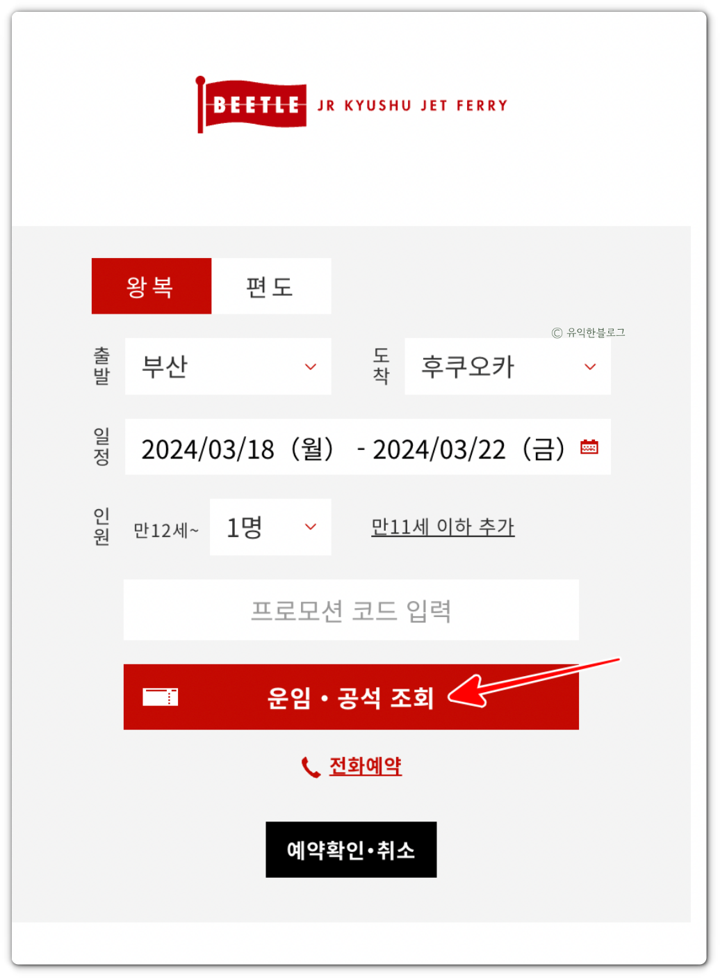 왕복/편도 여부, 출발지 및 도착지, 날짜, 인원 등을 입력한 뒤 [운임, 공석 조회] 버튼을 눌러 예약을 진행하면 됩니다.