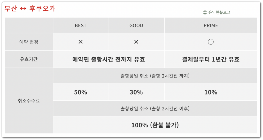 가격 차이가 나는 대신 취소 수수료 등에서 차이가 발생해요. 구체적인 내용은 아래 표를 참고하면 됩니다.