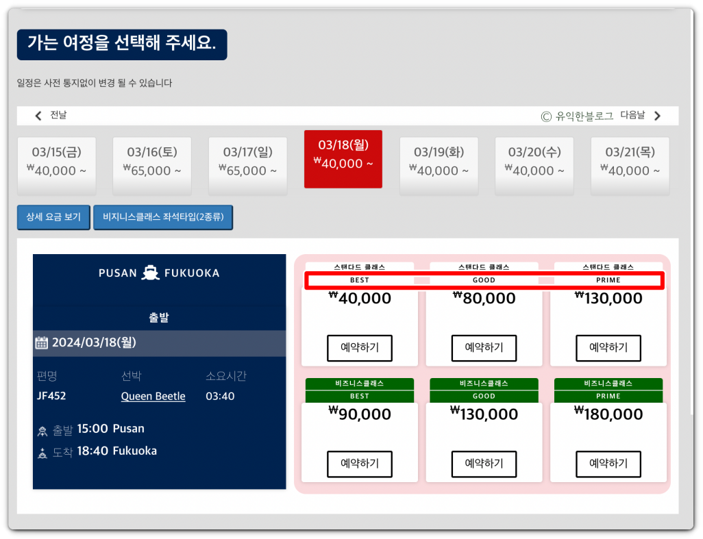 아래는 운임 조회 화면입니다. 운임이 ‘BEST’, ‘GOOD’, ‘PRIME’ 3종류로 나뉘어져 있는 것을 볼 수 있는데요, BEST가 가장 저렴하고, PRIME이 가장 비싸다고 보면 됩니다.
