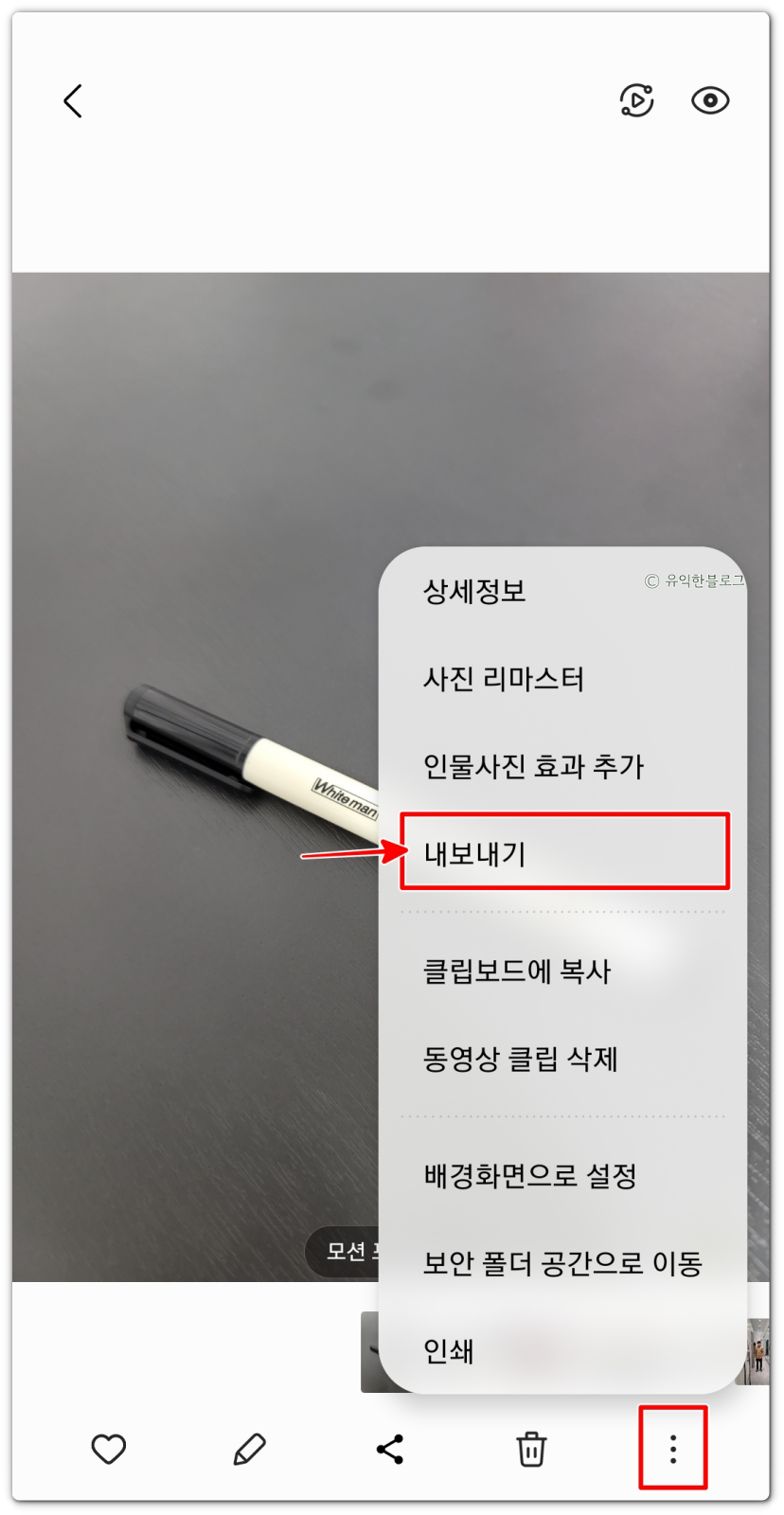 gif 파일을 만들기 위해서는, 하단에 있는 아이콘들 중 가장 오른쪽에 있는 점 3개 아이콘을 누르면 여러가지 메뉴들이 뜨는데, 여기서 ‘내보내기’ 버튼을 선택해 줍니다.