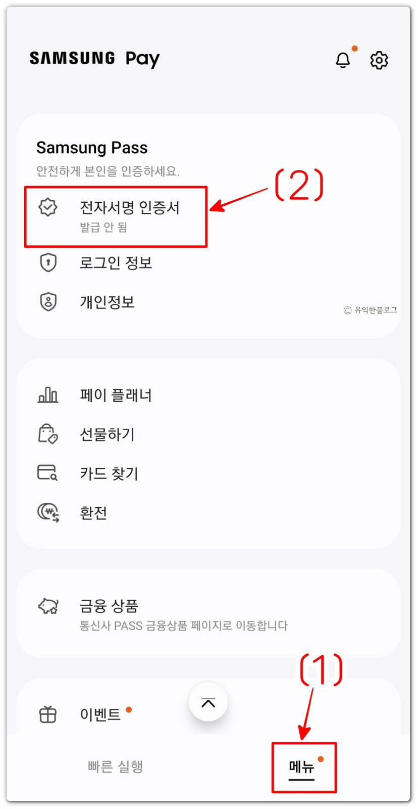 삼성페이 앱을 연 뒤, 하단의 [메뉴]를 선택해줍니다. 그리고 화면을 아래로 내리면, [Samsung Pass]라고 되어 있는 부분에 ‘전자서명 인증서’ 라고 되어 있는 게 보일 것입니다.