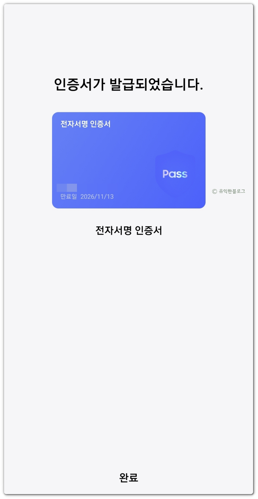 아래와 같이 ‘인증서가 발급되었습니다’ 라는 화면이 뜨면, 정상적으로 인증서가 발급된 것입니다.