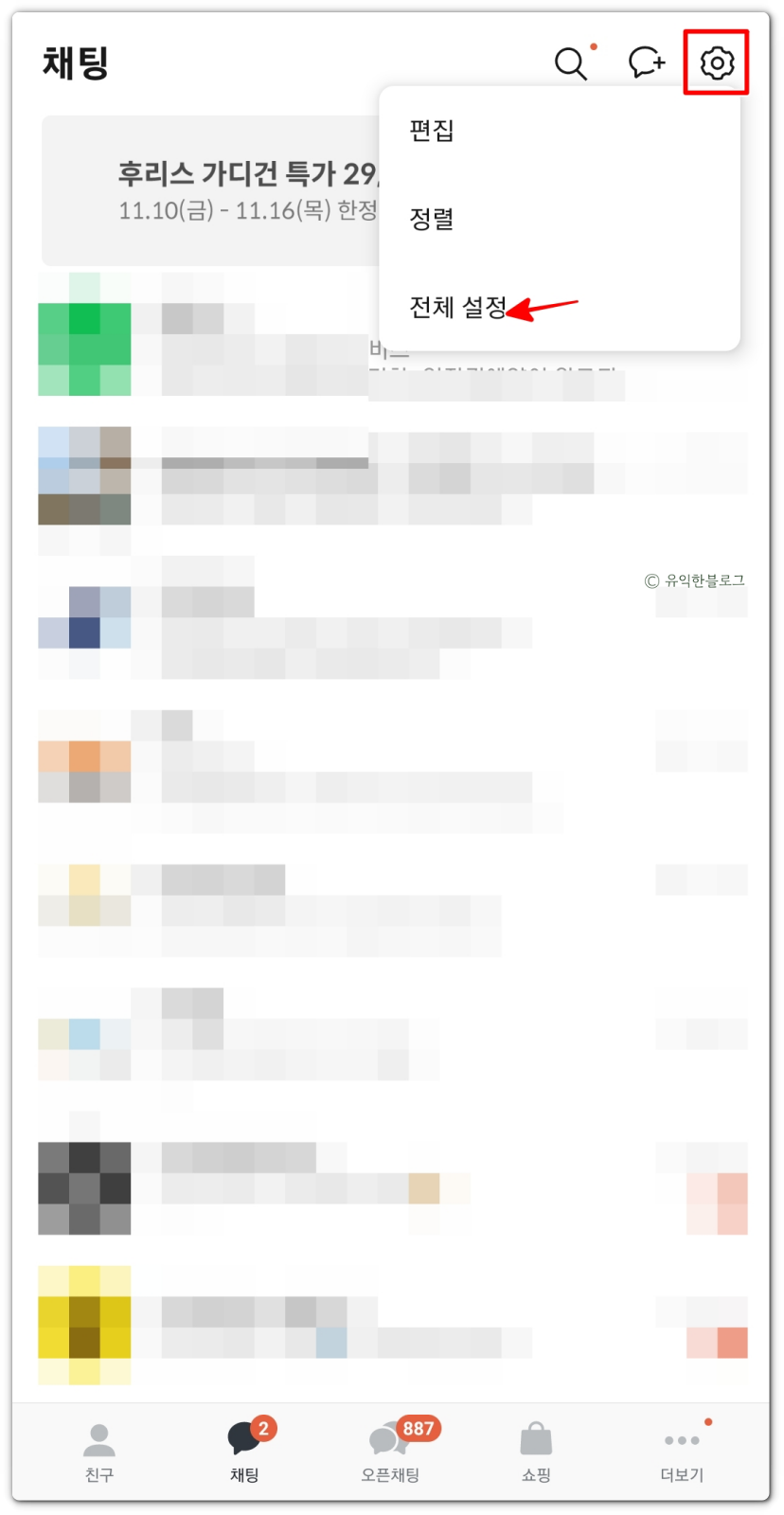 카카오톡 실행 후, 오른쪽 상단에 있는 톱니바퀴 아이콘을 누릅니다. 그리고 [전체 설정] 메뉴를 선택해 주세요.